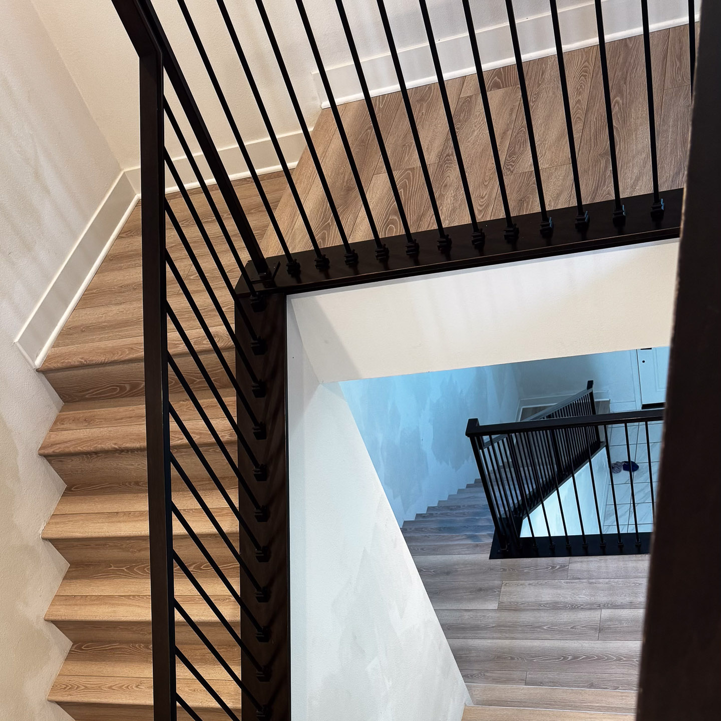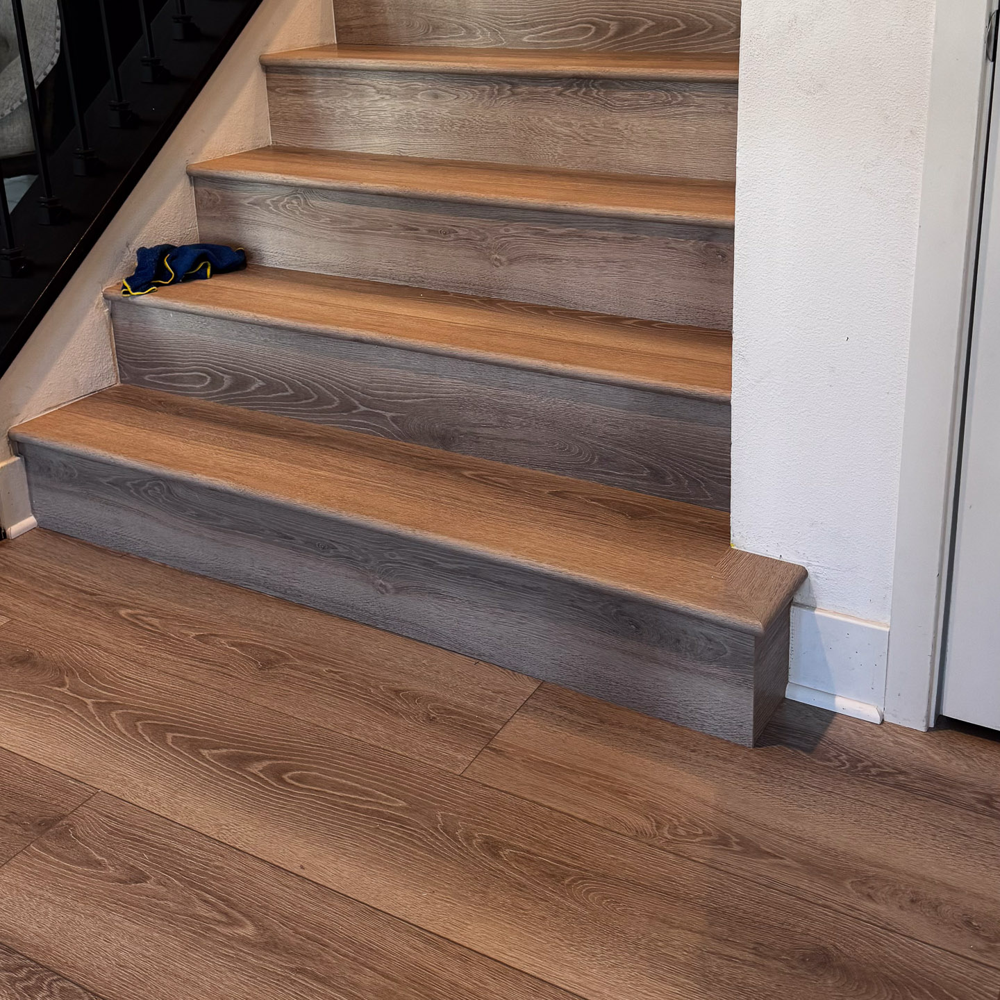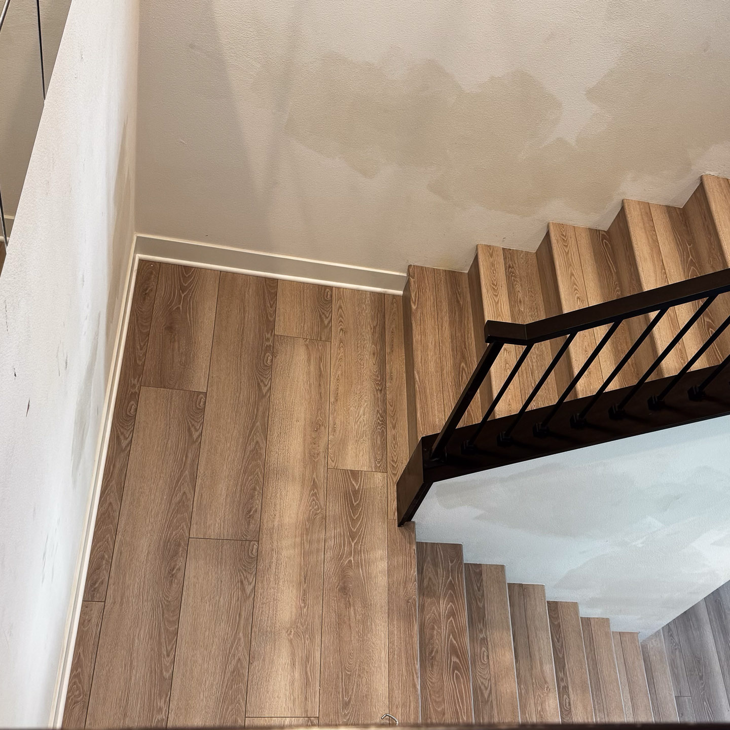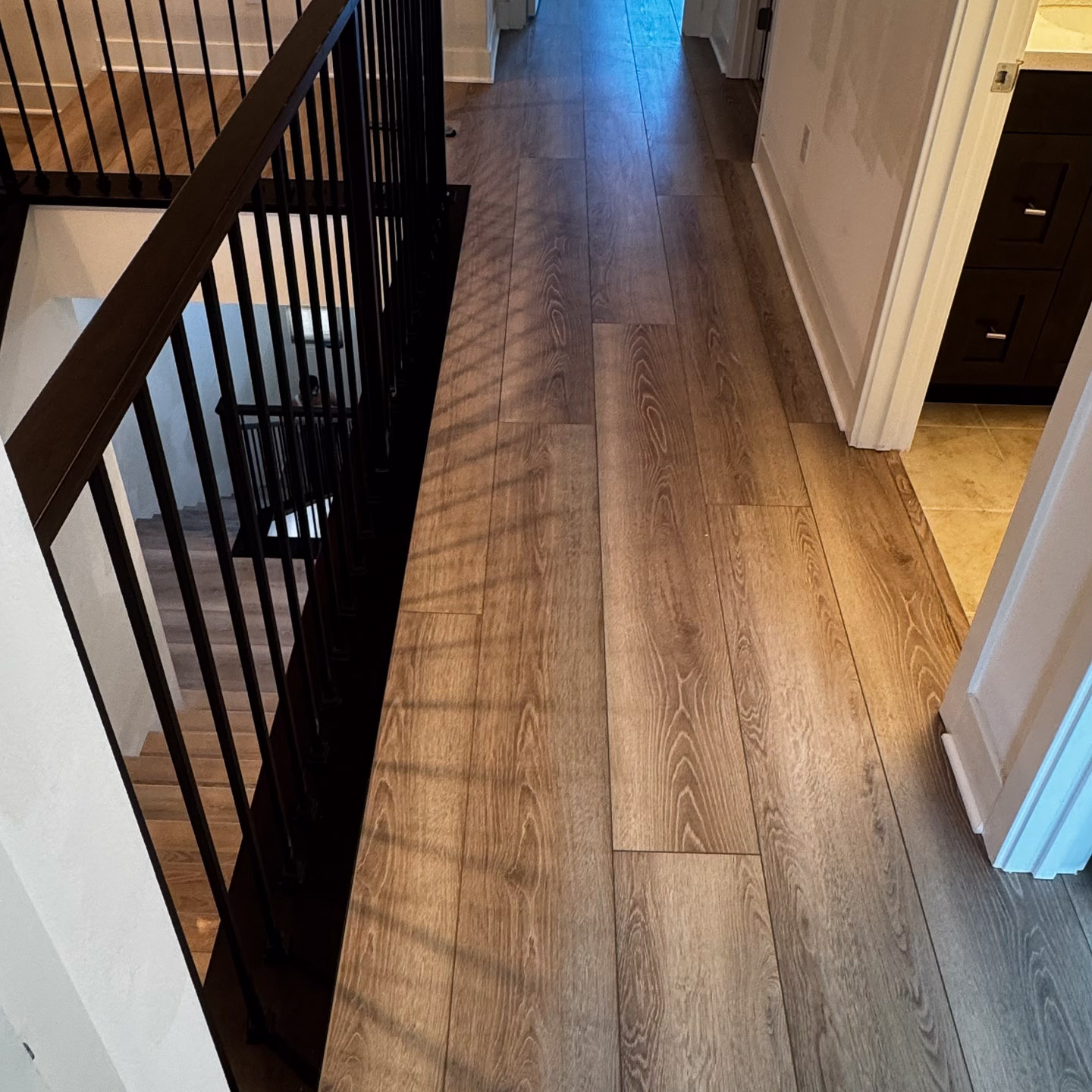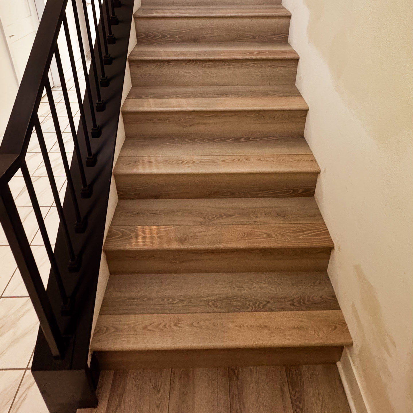 The stairwells, often overlooked in home upgrades, now serve as a standout feature. Each step is cleanly finished, with consistent grain patterns and precise cuts that highlight the craftsmanship behind the installation.